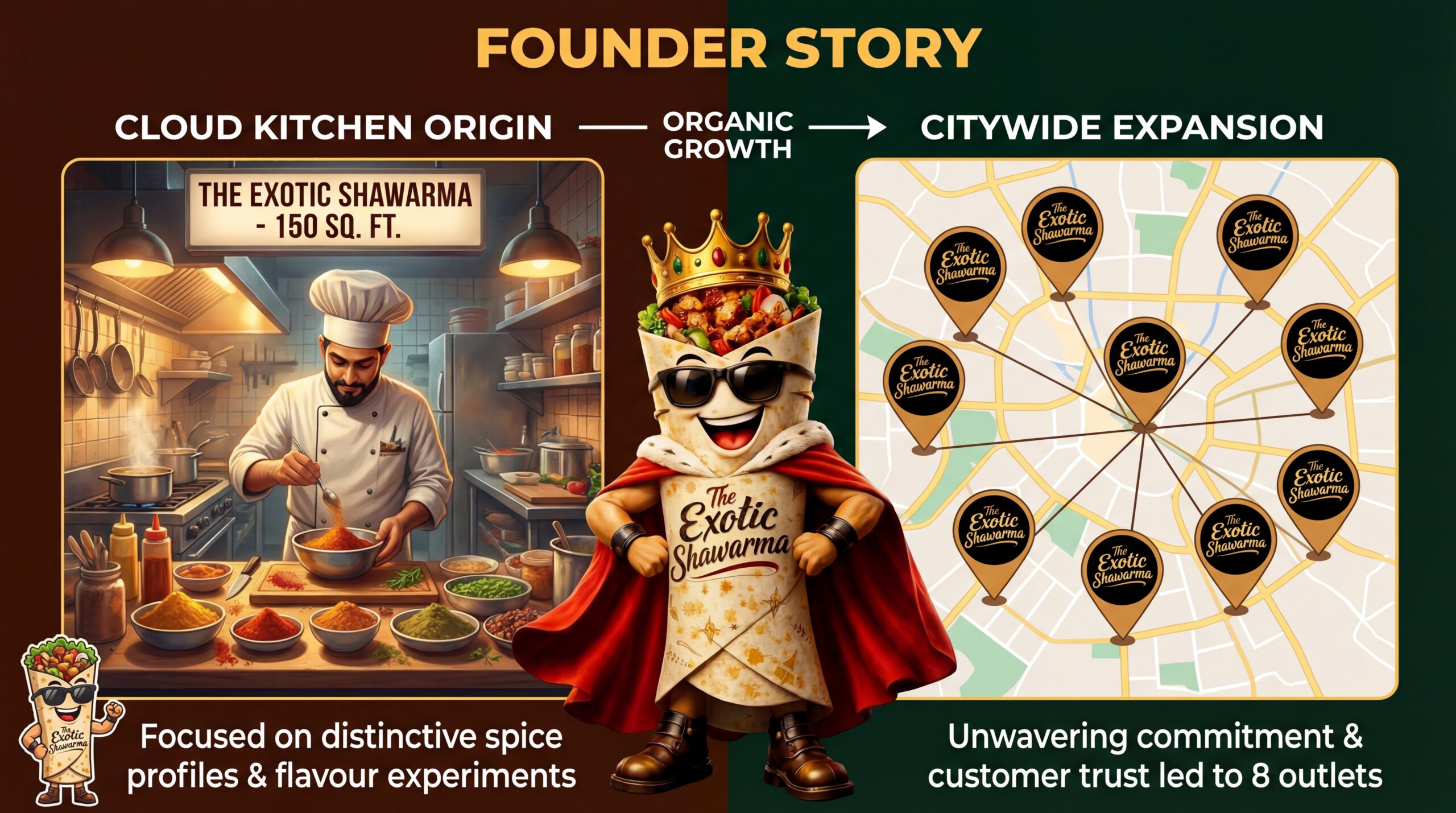 began with a compact 150 sq. ft. as a cloud kitchen and a singular focus on taste. At a time when shawarma brands were scarce, the emphasis was placed on developing distinctive spice profiles, experimenting with flavours, and delivering consistency with every order.